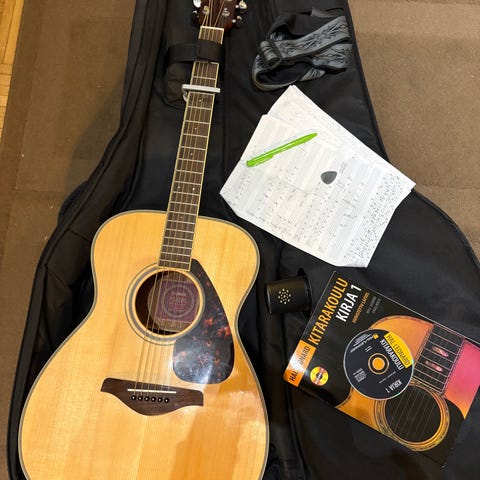 Mukaan plektroja, chords kirja, viritysmittari ja kitaralaukku (kitaralaukussa pehmuste tullut ulos kankaasta mutta pysyy kuitenkin paikoillaan)