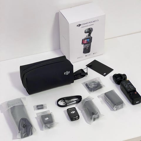 Mukana kaikki tarpeellinen Pocket 3:n käyttöön ja kuvaamiseen.