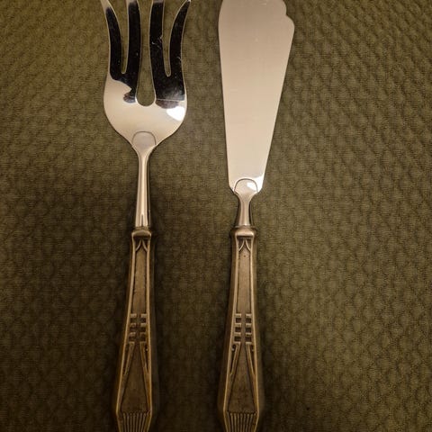 Myyn yhteensä neljä kappaletta hopeisia kakkuaterimia kerralla. Eli kaksi kakkuatrainta ja kaksi kakkuveistä. Kädensijat hopeaa ja päät terästä. Käytösta tullutta naarmua löytyy teräsososista. Kaikista löytyy hopean pitoisuusleima 830 ja muita leimoja. Kokonaispaino 356 grammaa.