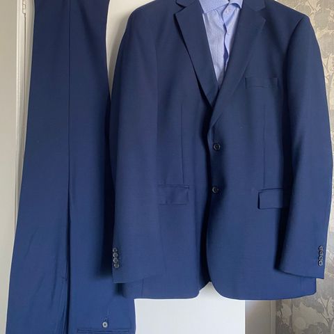Dressmannin miesten puku sinisessä värissä, valmistettu villasta/ polyesteristä Koko 52.