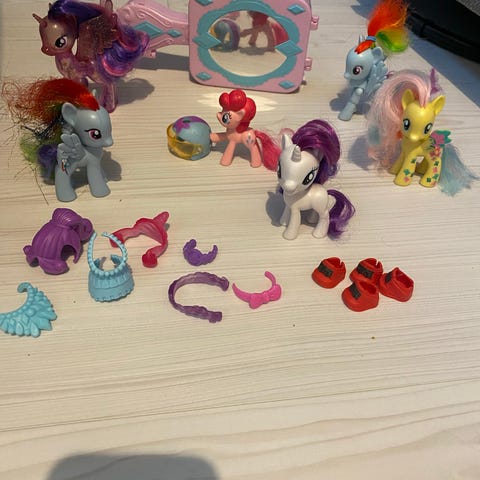 Surullinen setti erilaisia parittomia my little pony tavaroita: kenkiä, luistimia ym.