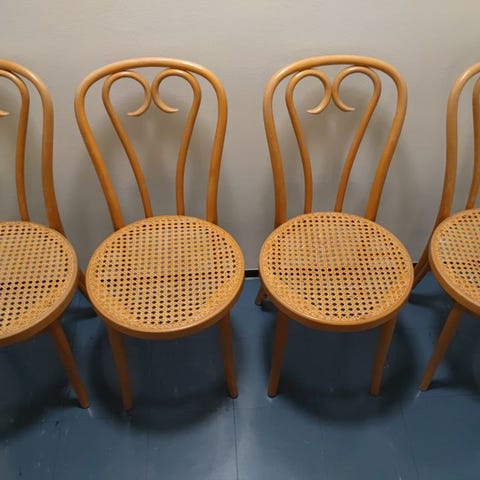 Valkoiset wieniläistuolit rottinki istuimella.