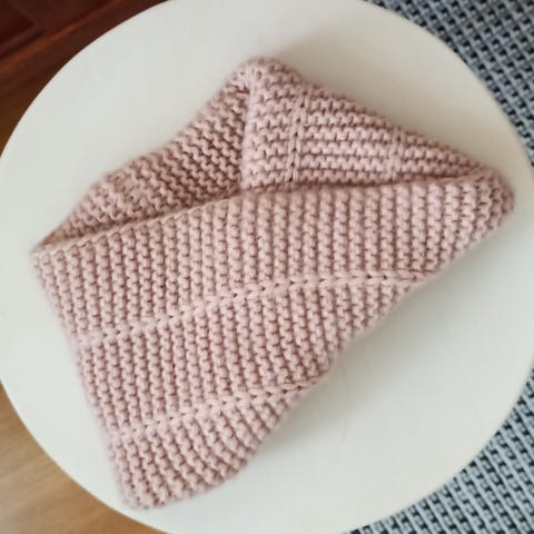 Heijastavasta langasta tehty neulepanta. Otettu käsityömessuilta, mutta jäänyt käyttämättä.