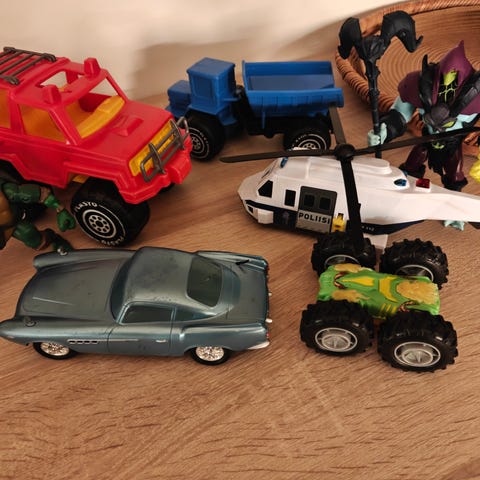 Muovipussillinen, uskosin että on 100 kpl erilaisia pieniä autoja ja hahmoja. Mukana on muun muassa kilpa-autoja, monster truck -tyylisiä autoja ja muita leluajoneuvoja. Leikkikalut ovat eri värejä ja materiaaleja, soveltuvat lasten leikkeihin.