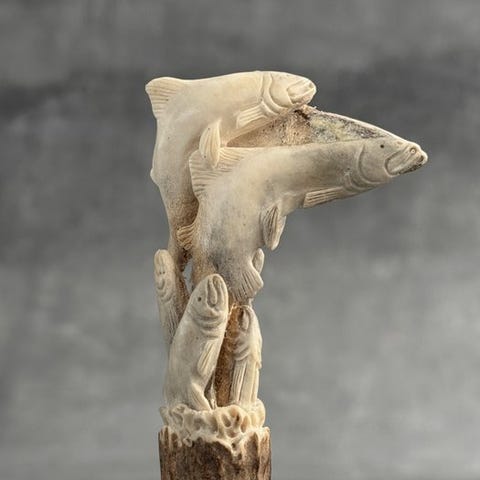 Hienovaraisesti veistetty valaan podi, tehty poron sarvesta, omistajalle räätälöidyllä jalustalla.