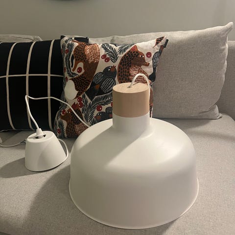IKEA kattovalaisin valkoinen, jossa valkoinen johto mustavalkoisella kuviolla. Valaisin on suunniteltu kattoon kiinnitettäväksi ja siinä on metallinen ripustuskupu. Sopii kodin valaistukseen.