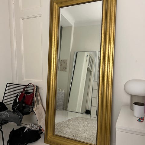 IKEA peili, jossa on koristeellinen metallikehys. Peili on täysipitkä ja soveltuu seisoma- tai seinäpeiliksi. Metallikehys on musta ja siinä on koristeellisia yksityiskohtia yläosassa. Peili tarjoaa käytännöllisen katselupinnan ja toimii myös sisustuselementtinä.