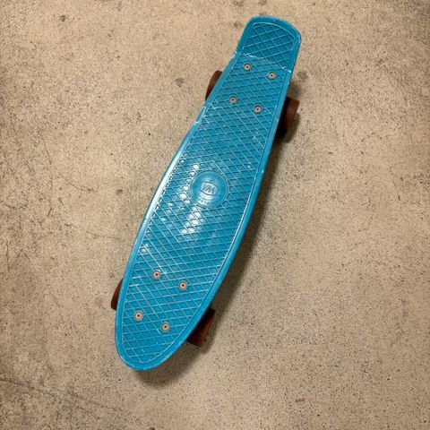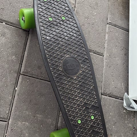 Penny vaaleanpunainen muovinen skeittilauta, jossa on vihreät pyörät.