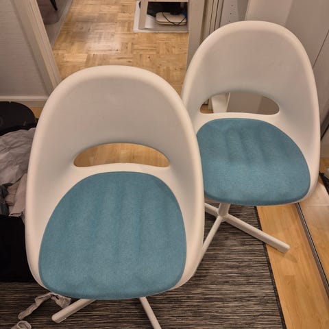 Myydään kaksi IKEAn lastentuolia, jossa pyörät ja säädettävä istuin. Tuolien värit vaaleanpunainen ja vaaleansininen. Ovat täysin ehjiä, mutta tarvitsevat kunnon pesun. Yhteishinta 20 euroa, 10 euroa/kpl.