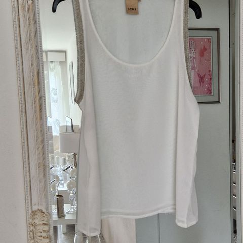 Myydään valkoinen toppi, jossa kangasruusuja. Koko M- menee pienelle L koolle. Trikoovuori.