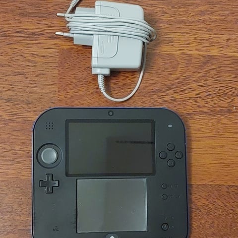 Nintendo 2DS pelikonsoli mustassa värissä. Laitteessa on kaksi näyttöä, joista alapuoli on kosketusnäyttö. Mukana muutama peli ja 4GB muistikortti ja laturi, kynä puuttuu