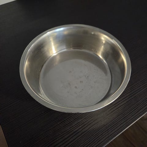 Pienen koiran ruokakipot. Pohja ei luista. Toisessa sisällä pieni halkeama. Sisäpohjissa naarmua ja pientä värjäymää.