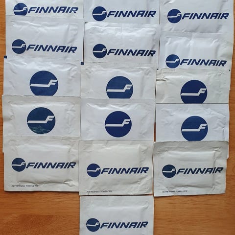 Finnair kosteuspyyheet, 23 kpl. Yhteishinta 50 euroa, voi ostaa erikseen 3 euroa kpl.