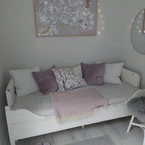 Antiikkinen puinen sohvasänky sinisellä verhoilulla