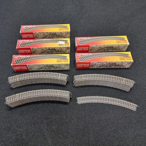 27x Fleischmann 6103 105 mm suorat profiiliradat. Kyseessä on 20 kappaletta alkuperäisessä pakkauksessa ja 7 kappaletta korvaavassa pakkauksessa.