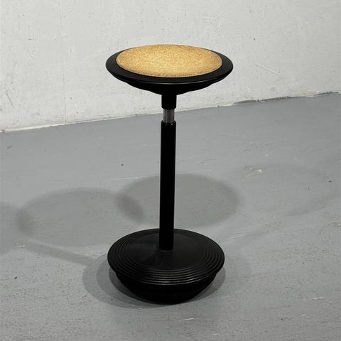 Wilkhahn Stitz jakkara, jossa on musta metallirunko ja korkkipäällysteinen istuin. Ergonominen tuoli, jossa iso korkeussäätö vara aina 60cm - 83cm asti. Alla kupera pinta, joka pakottaa istujan mikroliikkeisiin. Tämä jakkara on suunniteltu tarjoamaan dynaamista istumista, mikä edistää ergonomiaa ja mukavuutta pitkissä istunnoissa.