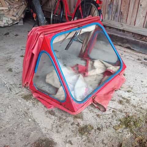 Eristetty metallirunkoinen koppi,kansi ja kaksi sivua aukeevat. pyörien päällä. sisämitat p100cmxl120cmxk135cm Hyvin tehty.