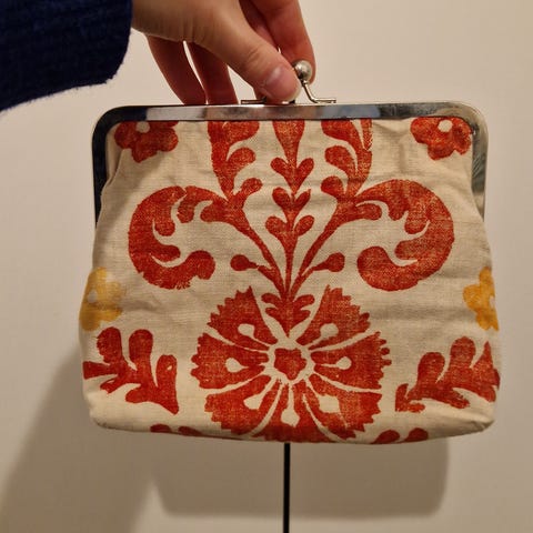 Turkoosia nahkaa ja kaukalosta kangasta sisältä, pussukka jossa kaksi korttitaskua sisällä.