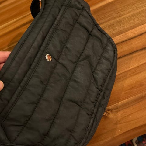 Marimekko olkalaukku, koko: Leveys 16cm, korkeus 21cm ,kantokahvan pituus 150cm. Valmistettu polyamidista. Laukussa vetoketjusuljenta, kaksi pientä vetoketjutaskua ulkopuolella ja yksi vetoketjutasku sisäpuolella. Säädettava olkahihna, ja siinä on pieni metallinen lenkki pienten tavaroiden kiinnittämistä varten. Laukun väri musta.