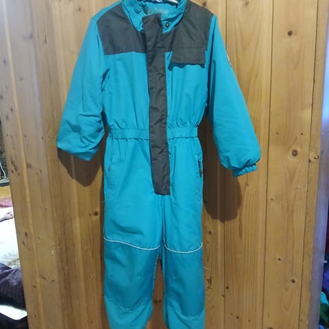 Ok kuntoinen, kulumaa/pehmentymää polvien ja takaosan kohdalla ja kauluksessa. Jalkarenksut puuttuu.