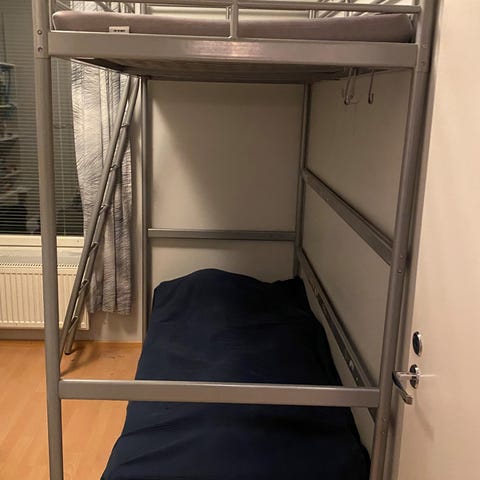 Myydään Ikea Svärta parvisänky isolla työpöydällä. Sängyn koko 90x200cm. rungon ulkomitat noin 98x208, korkeus n. 186. Tikkaat tulevat näiden mittojen päälle.