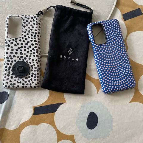 Vaaleanpunainen ja musta suojakuori. Yhteensä 5 e.