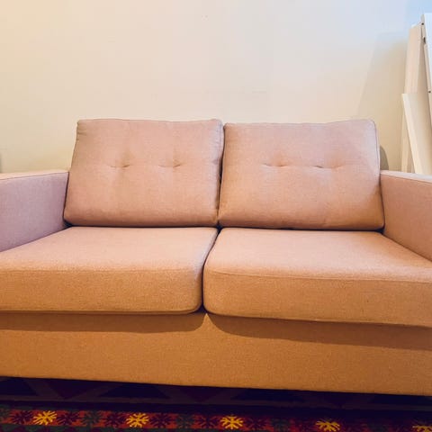 Annetaan beige 3 istuttava sohva. Istuin tyynyt sekä selkänojat iroitettavat, myös päälliset irrotettavissa.