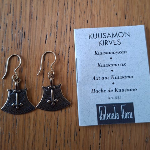 Käytössä olleet Kalevalan pronssiset Kuusamon kirves-korvakorut. Rasiaa ei ole. Pakettiautomaattilähetys Manner-Suomeen 6 euroa, josta saa lähetyksen seurantanumeron. Nouto Kuopiosta keskustasta. Jos ostat kolme (3) myyntikohdettani, maksan pakettiautomaattilähetyksen Manner-Suomeen.