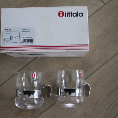 Myytävänä kauniit Paula-glögilasit lautasineen.