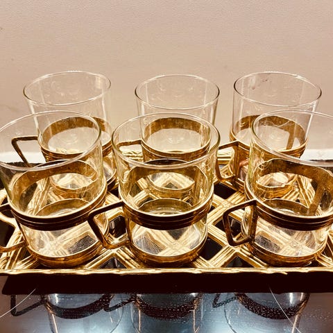 Hienot n.30-40 vuotta vanhat glögilasit. 6 kpl. Yhdestä puuttuu lasi. Hinta yhteensä 80€.
