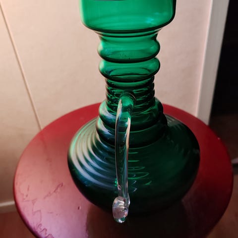Tamara Aladinin Riihimäen lasille suunnittelema Kleopatra maljakko, kork. n. 200 mm. Kahvan kiinnityskohdassa roso. Nouto Kuopiosta keskustasta.