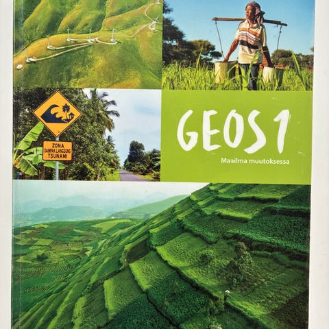 Lukion maantiede Geos 1-4 oppikirjasarja sisältää seuraavat osat: Geos 1 Maailma muutoksessa, Geos 2 Sininen planeetta, Geos 3 Yhteinen maailma ja Geos 4 Geomedia - tutki, osallistu ja vaikuta. Kirjat on suunnattu lukion maantiedon opiskeluun. Kirjat ovat hyvässä kunnossa, mutta joissain saattaa olla pieniä ulkonäöllisiä vikoja.
