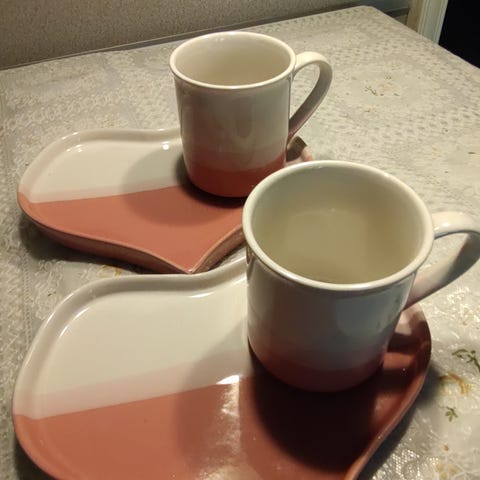 Kermansavi mukeja, kermakko, tarjoiluastia ja lautasia
