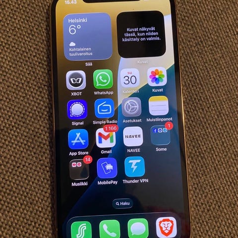 Apple iPhone 12 älypuhelin, 64 GB tallennustilalla. Akun kunto on 79 %. Kuvassa näkyvä MagSafe-kuori ja latauskaapelit mukaan.