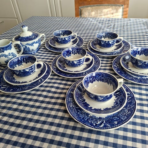 Klassiset Arabia Sininen maisema (Blue Landscape) kahvikupit ja lautaset, valmistettu Suomessa. Sarjaan kuuluu kahvikuppeja 3kpl, aluslautasia/tassit 4 kpl ja 6 kpl leipä/pullalautasta, joissa on sininen brittiläinen maisemakuosi.