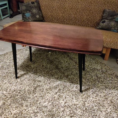 Hyväkuntoinen ja näyttävä vintage-sohvapöytä reunakoristeluin. Jalat saa kuljetuksen ajaksi pois, mutterikiinnitys.