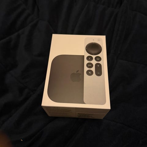 Apple TV 4K mediasoitin musta. Laite on suunniteltu suoratoistoon ja sisältää käyttöjärjestelmän Apple TV OS. Mukana kaukosäädin.