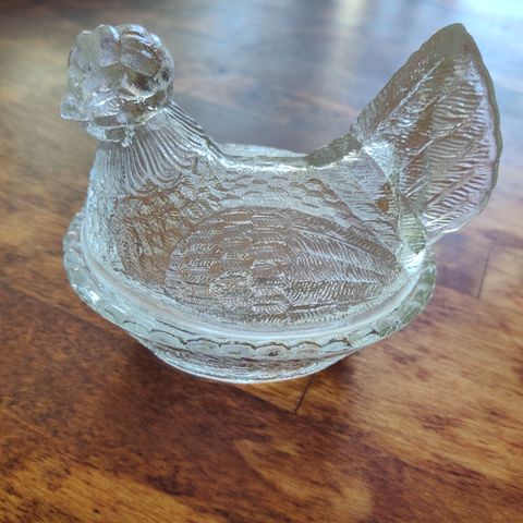 Kirkas iso kannellinen kana. Alaosassa pari pientä palaa / säröä. Muuten ehkä. Kansi menee normaalisti kiinni ja kana on ehjä. Kissatalous.