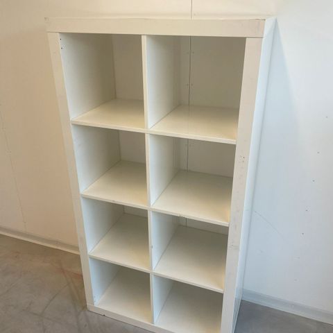 Ikean Kallax 4x4 hyllykkö, sisältää kuvassa näkyvät kaapit ja kangaskorit.