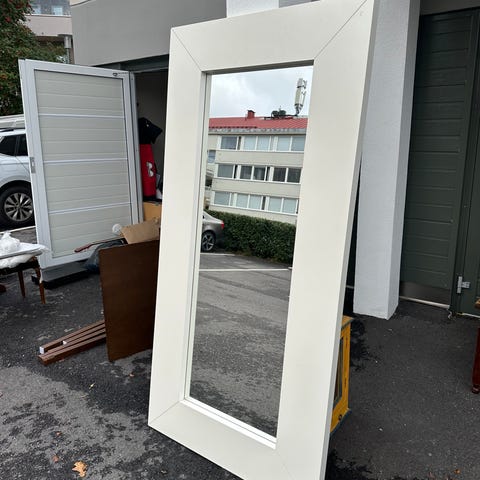 Isokokoinen peili mustilla leveillä kehyksillä. Kehys on kiiltäväpintainen. Peilin kunto on oikein hyvä. Ripustusvaijeri asennettu siten, että peili on pystyasennossa. Ulkomitat 134,5 x 54,5 cm. Vain nouto.