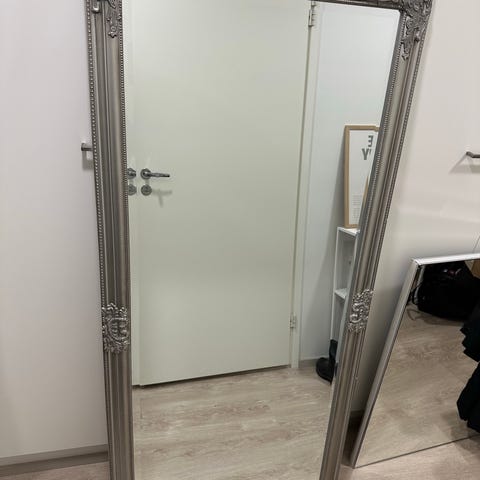 Myydään hopeinen koristeellinen kokovartalopeili, joka malliltaan Jyskin Nordborg (https://jysk.fi/sisustus/peilit/peili-nordborg-72x162-hopea?article=3805075#product-intro). Peili on hyväkuntoinen. Kooltaan 72cm leveä ja 162cm korkea.