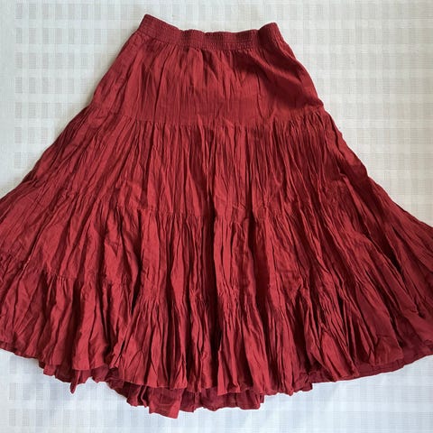 Punainen skottiruudullinen hame, naisten koko 36. Materiaali koostuu 40% polyesteristä, 30% akryylistä, 20% villasta ja 10% muista kuiduista. Hameessa on takaosassa vetoketju, yläosassa vuori ja se on suunniteltu naisille. Hameen pituus 50 cm.