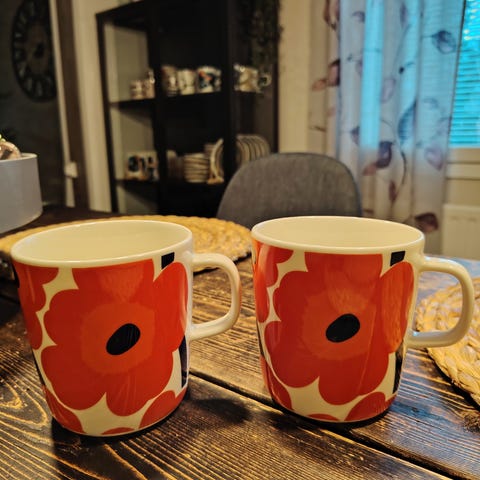 Marimekko mukit eri kuoseilla. Mukit ovat posliinia ja niissä on erilaisia kuviollisia ja värillisiä malleja. Mukit on käyttööottopesty ja 2,5 DL paitsi kuvan 4 unikkomuki 4dl ja siinä vielä tarrat kiinni.