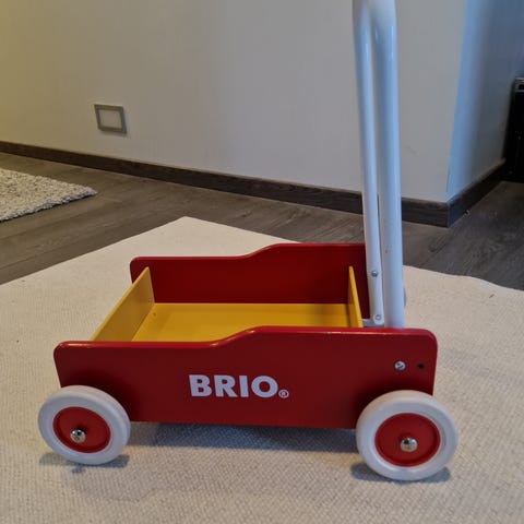 BRIO lasten työntökärry musta, jossa valkoiset ja punaiset pyörät. Kärry on suunniteltu lasten käyttöön ja soveltuu leikkeihin ja tavaroiden kuljettamiseen.