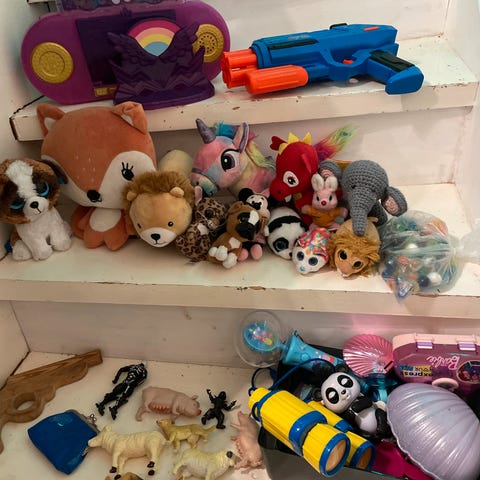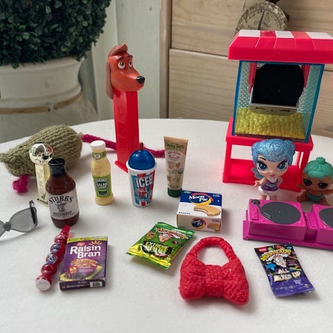 Myynnissä erilaisia leluja esim. piano, harja, peili, delfiini, sakset, koppa. Kaikki yhteensä 1€