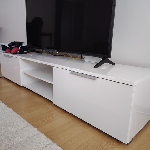 Ikean Tv-taso bestå sarja. Kunto hyvä vaikkakin käytön jälkiä näkyy. Tv-tason päällä on maitolasi joka on kiinni kaksipuoleisella teipillä