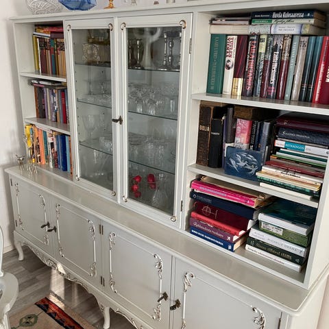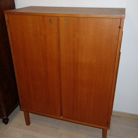 Teak -kirjahylly, jossa lasiovet tallella ja ehjät.