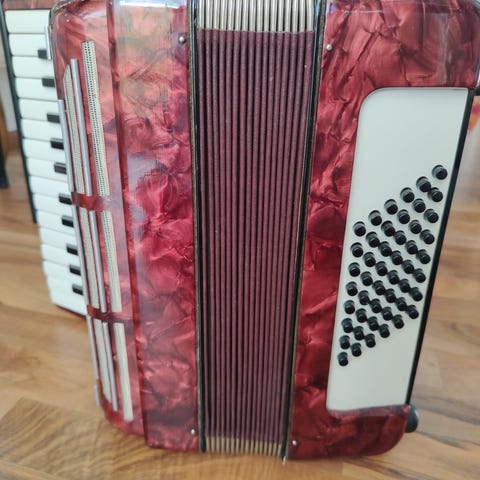 Vihreä ja valkoinen harmonikka, jossa on pianonäppäimistö ja mustavalkoiset koskettimet. Sopii harmonikan soittamiseen ja musiikin harrastamiseen.