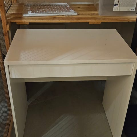 Käytetty IKEAn meikkipöytä. Ison laatikon sisäpuolinen pieni tilanjakajalevy on korkannut levyn päistä. Sen saa kyllä mukaan.