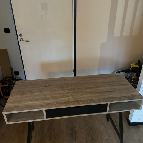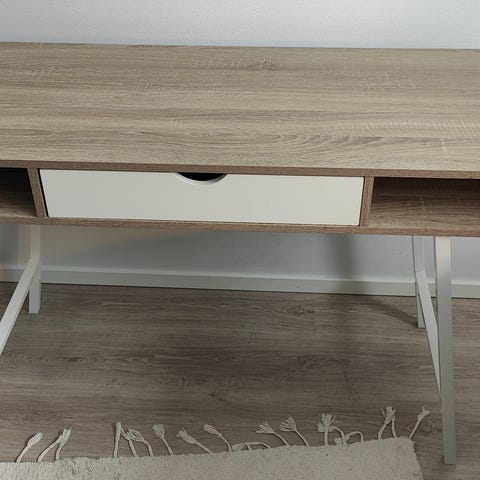 Hyvässä kunnossa oleva valkoinen/luonnonvärunen työpöytä. Pari todella pientä kulumaa, kuvissa näkyvät verrattuna sormeen.